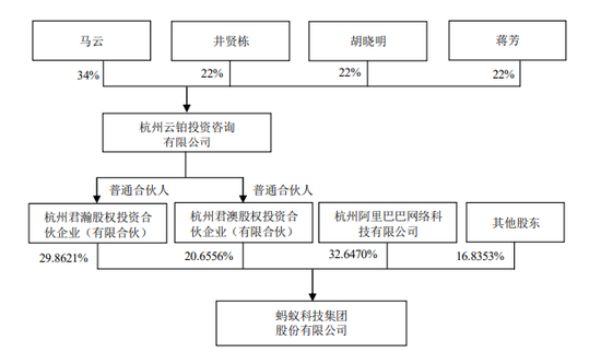 与此同时,杭州云铂投资咨询有限公司(简称“云铂投资”)也在8月21日发生了工商变更,马云在该公司的持股比例由100%下降至34%,新增股东胡晓明、蒋芳、井贤栋分别持股22%。股权穿透图显示,云铂投资通过杭州君澳股权投资合伙企业(有限合伙)、杭州君瀚股权投资合伙企业(有限合伙)间接持有蚂蚁科技集团股份有限公司的股份。