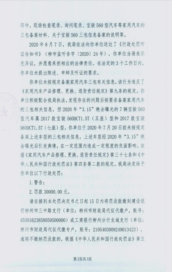 8月26日,中国消费者报记者从广西柳州市场监管局网站获悉:上汽通用五菱汽车股份有限公司因违反汽车三包备案制度被广西柳州市市场监管局处以警告并顶格罚款3万元。