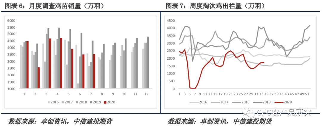 供给方面决定了长期的鸡蛋价格重心。近五年内最高的存栏水平,也对应了正常情况下的同期最低价格(17年禽流感属于特殊状况)。从淘鸡鸡龄来看,天下粮仓数据显示,自鸡蛋价格好转以来,淘鸡鸡龄逐渐从450天左右回升至490天附近,考虑到18~19年平均淘鸡鸡龄都在520天左右,未来淘鸡方面向上向下的弹性都有所加大。而要实现超淘,要么先实现蛋价的崩塌,要么先实现淘鸡价格的猛涨,后者看起来可能性较小。
