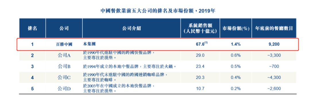 根据弗若斯特沙利文报告,按照2019年系统销售额计,百胜中国是中国最大的餐饮企业。截至2020年6月30日,百胜中国有9954家餐厅,主要覆盖1400多个城市。而截至2020年7月,百胜中国的餐厅网络已突破10000家门店。
