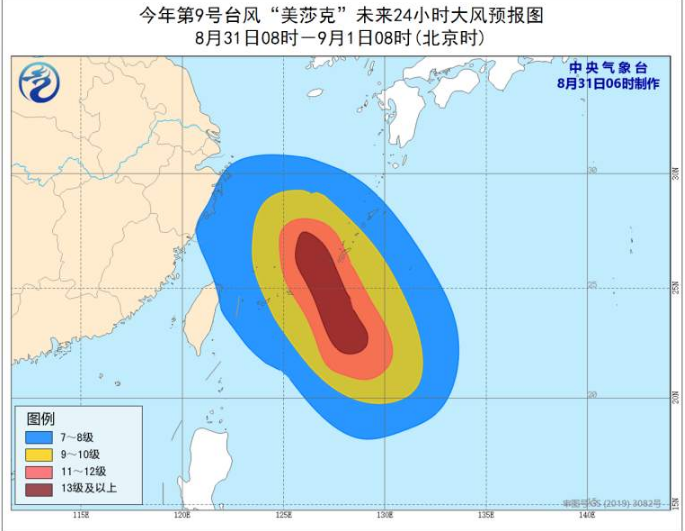 8月31日08时至9月1日08时,台湾以东洋面、东海大部、台湾岛东北部沿海、浙江沿海将有7-9级大风,其中东海东南部海域风力有10-12级,台风中心经过的附近海域风力可达13-17级,阵风17级及以上。