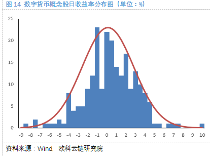 下图比较了数字货币概念股的日收益率直方图和正态分布,概念股的日收益峰值明显左偏。金融市场中的肥尾通常出现在左侧,但是数字货币概念股右侧也出现了肥尾,反映了数字货币概念股偶尔会获得较高收益,和政策利好下数字货币大涨的情形吻合。
