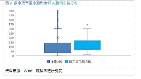 截止至撰稿,数字货币概念股的股价大多低于30元,其中48.1%介于5-15元之间,没有低于5元的股票。总市值在50-100亿人民币处最为集中,和整个A股上市企业相比,如图所示,数字货币概念股总市值平均值略高于A股平均市值,但A股存在较多市值很高的离散点,A股市值中位数高于概念股的中位数,图9中未全部显示A股的离散点。