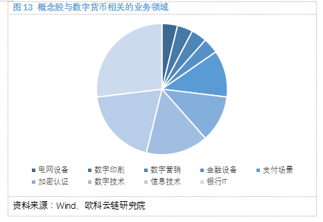 下图概括了各个概念股与数字货币的相关领域,其中,有的企业同时涵盖多个相关领域,则以其最大的业务作为相关领域。从统计结果可以看出,银行IT、信息技术、数字技术、加密认证、支付场景领域较为广泛,占81.5%。