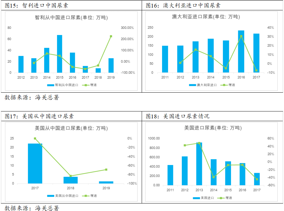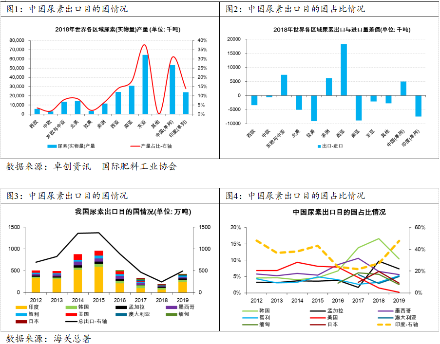 关于美国的需求评估,经查联合国粮农组织数据,美国是主要的尿素生产国和消费国,美国国内尿素自产量从2011年280.4万吨增加至2017年473.4万吨,美国国内尿素进口量从2013年916万吨减少至2017年265.03万吨,主要是自2014年美国页岩气革命以来美国国内新建几套尿素产能装置以部分满足美国国内的尿素需求。美国自2017年至2019年从中国进口尿素由22.22万吨下滑至1.1万吨,这主要是因为美国国内新建尿素产能后除基本可满足国内需求外甚至有部分尿素出口至北美其他地区,我们预期对美国出口尿素的量可能继续维持低位。