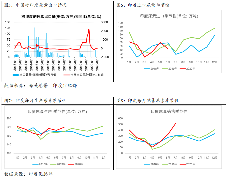 印度是中国尿素出口的第一大目的国,2019年中国尿素出口到印度市场的数量为236.3万吨,占比总出口量为47.8%,2012-2019年期间中国尿素出口印度占比呈现先回落再提升的趋势,整体占比区间在22%-48%。当前,印度新冠肺炎疫情尚未得到控制且仍处于上升趋势中,大批城市务工农民前期已返乡种植农作物,叠加印度人口众多导致粮食需求较大,下半年9-12月份印度主要种植旱季玉米、夏季水稻、冬小麦、蔗糖等粮食作物以满足印度国内需求,故我们预测印度对尿素在内的肥料需求恐有明显增长。据印度肥料部数据,2018年和2019年印度尿素市场在7-12月份的累计销量分别为1686万吨和1891万吨,销量增速同比为12.2%。考虑到今年全球粮食危机预警和印度大批城市务工农民前期已返乡种植农作物,我们给定预期2020年7-12月份期间印度化肥销量有望再次增加5%至17.2%,即届时需要提供尿素约2220万吨,而印度国内尿素年产能为2390万吨/年,按照装置开工负荷95%-110%计算,印度国内提供尿素量大概为1280万吨,印度仍有940万吨尿素缺口,这块供应缺口需要在7-12月份期间陆续进口来弥补。按照中国货源出口印度市场整体占比区间在22%-48%,按照近期印度尿素招标过程中出现的对中国尿素的依赖问题,若以平均占比40-50%计算,则中国货源有望出口376-470万吨,取折中数据423万吨来评估中国出口增速情况。