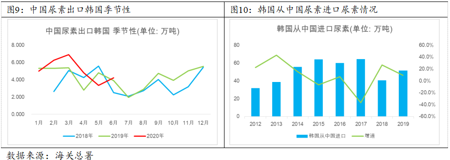 经查相关资料,韩国农业资源禀赋非常稀缺,主要的粮食种植作物是水稻,现今是世界人均耕地面积最少的国家之一,很多农产品(比如玉米、麦类、豆类)都必须主要从国外进口才能满足居民的需要。韩国的水稻种植周期一般在每年的5月到10月或11月,根据联合国粮农组织数据,韩国国内不产尿素,种植水稻在内的农作物所需的尿素全靠进口,当前季节接近9月份,韩国国内本年度使用的尿素大概率已储备好,未来9-12月份韩国尿素的进口主要满足下一年度农业种植作物的需求或者一些经济作物的用肥需求。在联合国已发布粮食危机预警的背景下,考虑到韩国独特的农业资源禀赋,我们推测韩国在7-12月份期间进口中国尿素的量较难超预期增加,参考以往韩国从中国进口尿素的平均增速10%来看,我们给个15%的预期进口增速,即下半年7-12月份韩国有望进口中国尿素27.7万吨。