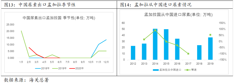 经查相关资料,孟加拉国属于热带季风气候,其主要的种植粮食作物是水稻、小麦、豆类、油籽、马铃薯、甘薯。另外,孟加拉国耕地面积中的80%用于种植水稻,水稻可种三季(分为春季稻、夏季稻和冬季稻),全年分为冬季(11-2月),夏季(3-6月)和雨季(7-10月),其中雨季(7-10月)是种植旺季亦是用肥需求旺季。根据联合国粮农组织相关数据,孟加拉国自有尿素产能大概150万吨,每年需要额外进口80-100万吨尿素以满足国内需求。考虑到孟加拉国主要农作物水稻种植面积可增加有限,孟加拉未来国内尿素需求增加的空间有限,我们对孟加拉国进口尿素增速20%至120万吨,对照孟加拉国尿素进口的季节性特征以及中国货源占比50%的条件,我们推测下半年7-12月份孟加拉国进口中国尿素乐观估计约40-60万吨。