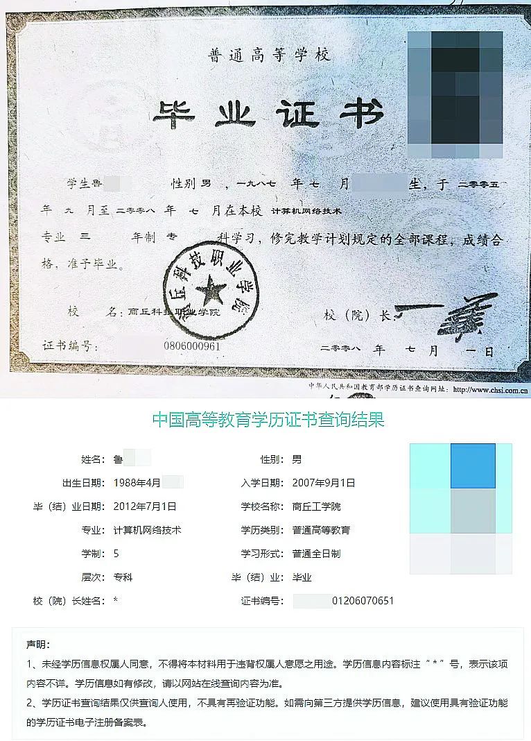 鲁明当时也接到了岳绍瑞的电话。他在学信网上查询,结果让他感到匪夷所思。他的毕业证书显示,生于1987年7月19日的鲁家豪2008年从商丘科技职业学院计算机网络技术专业毕业。但在学信网上,无法根据编号查询这张毕业证书。而根据他本人的身份信息查询显示,生于1988年的鲁家豪2012年取得了商丘工学院五年制大专的学历,入校时间是2007年。