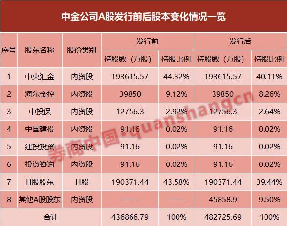 在发行前,中金公司总股本为43.69亿股,其中内资股24.65亿股,占总股本56,42%;H股19.04亿股,占总股本43.58%。如中金公司不再修改发行方案,按照发行4.59亿股(不超过总股本9.5%)计算,其发行前后股本结构如下: