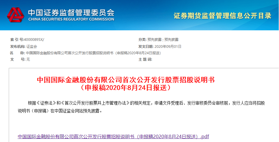 9月1日,证监会官网发布中金公司IPO招股说明书(申报稿,8月24日报送),该公司将发行股数不超过4.59亿股(占总股本比例不超过9.5%),拟在上交所上市。