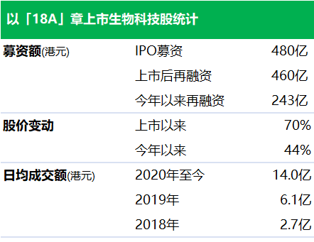 根据港交所发表统计,现时共有20家生物科技公司根据上市规则18A章上市,其IPO加上后续配股集资额累积达940亿元。再融资市场亦非常活跃,其中百济神州(06160.HK)配股集资21亿美元,为今年全球生物科技股规模最大的再融资。