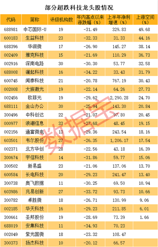 数据宝统计了和韦尔股份类似的科技股,即机构评级数量在10家以上、中报净利增长超30%、最新价较年内高点回调超20%的个股,合计共有26只。其中,安集科技、澜起科技、兆易创新、生益科技等个股最新价较年内高点回调均超过30%。