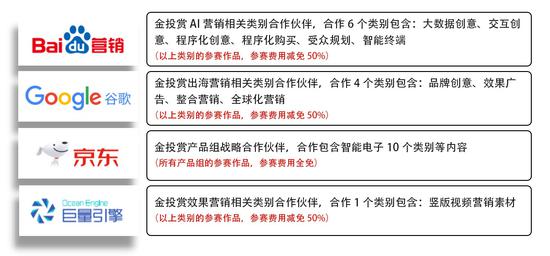 为了鼓励更多的企业参与比赛,集结到行业最优秀的商业创意,2020金投赏与巨量引擎、百度、京东、Google达成合作,为不同类别的参赛作品给予特别支持: