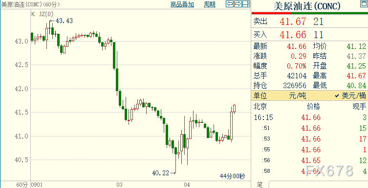 北京时间16:15,NYMEX原油期货上涨0.73%至41.67美元/桶;ICE布伦特原油期货上涨0.54%至44.33美元/桶。两市本周累计分别下跌2.96%和3.55%。