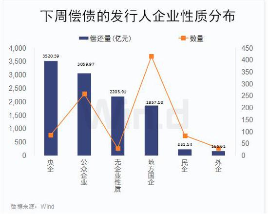 具体债券发行人,首先企业性质上:下周央企偿还量最大,共87只债券合计达3520.59亿,紧随其后为公众企业,259只债券需要偿还3059.97亿,另外一些如国债、地方债等无企业性质的债券偿还也在2000亿以上,此外地方国企偿还总量也不少,超过1800亿。其余民企、外企等需要兑付的规模都很小,均不到250亿,自然兑付风险也不大。