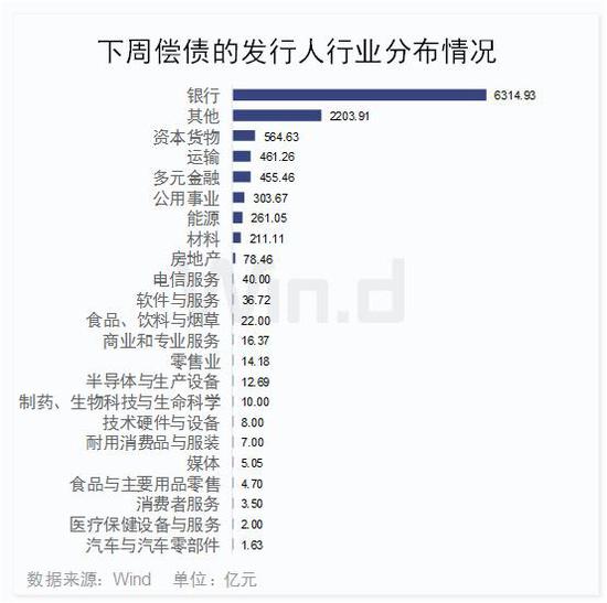 而需要偿债的发行人所属行业上看,银行业下周偿还量达6314.93亿位居首位。紧随其后,其他无行业需要偿债的规模也较大,达2200亿。另外资本货物、运输、多元金融等6大行业需要偿还的金额都在200亿以上,而其余行业偿债规模都不大。如汽车与汽车零部件、医疗保健设备与服务等7个行业需要偿还的金额均不到10亿。可见下周各大行业面临的兑付压力差异巨大,但由于企业体量不同,并不意味着偿还金额大的行业中企业风险就大。