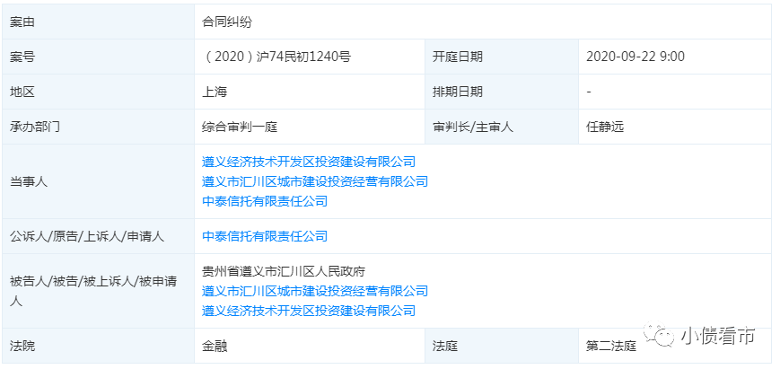 《小债看市》注意到,除了天禄谈信托,国通信托外,遵义经开投还涉及与中泰信托的合同纠纷,受理法院为上海金融法院,将于9月22日开庭。