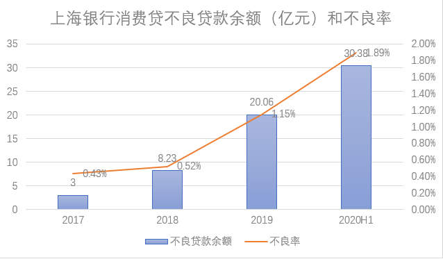 尽管消费贷的规模有所下降,但该行消费贷不良贷款的规模增长明显。据年报显示,2017年-2020年上半年,上海银行的消费贷不良贷款余额分别为3.00亿元、8.23亿元、20.06亿元和30.38亿元;同期,不良贷款率分别为0.43%、0.52%、1.15%和1.89%。