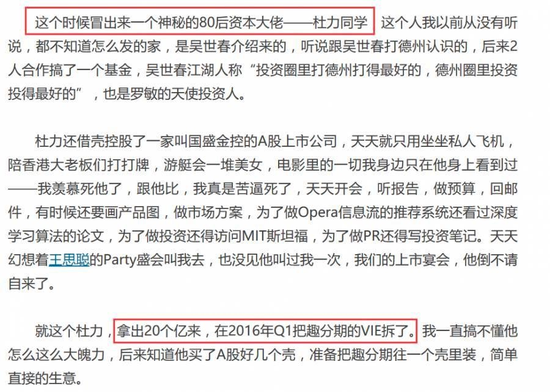 杜力,作为资本市场新晋的神秘“80后资本大佬”,参控股3家上市公司,日常的生活是“坐坐私人飞机,陪香港大老板们打打牌,游艇会一堆美女。”写下这段描述的昆仑万维前总经理周亚辉直言,“电影里的一切我身边只在他身上看到过——我羡慕死他了”。