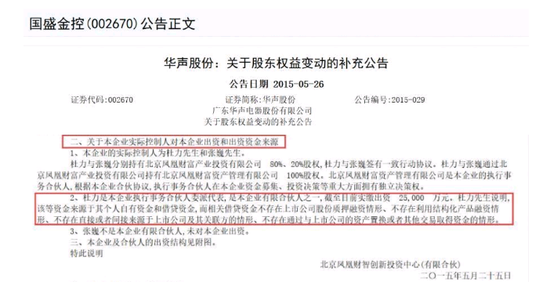 杜力在A股的风云生涯,也要从2015年国盛金控(原“华声股份”,自2016年8月17日起,公司证券简称由“华声股份”变更为“国盛金控”)的一份公告说起。