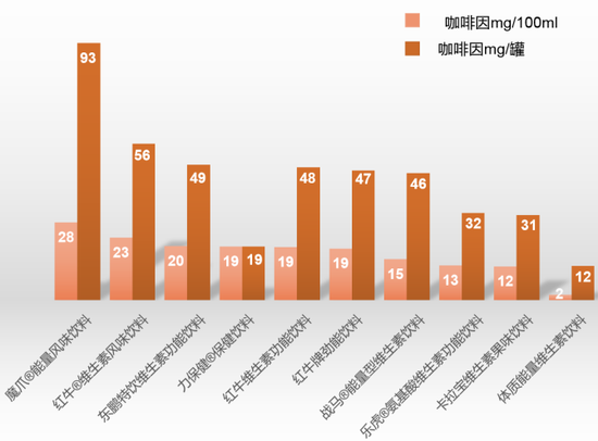 10款样品咖啡因含量均在健康成人的每日安全摄入量的范围内。风味饮料魔爪的咖啡因含量最高28mg/100ml(换算成93mg/罐),相当于一杯美式咖啡。
