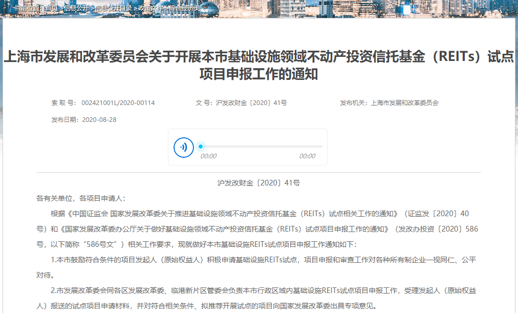 8月28日,上海市发改委发布《上海市发展和改革委员会关于开展本市基础设施领域不动产投资信托基金(REITs)试点项目申报工作的通知》,上海市基础设施REITs试点项目申报启动。上海市鼓励符合条件的项目发起人(原始权益人)积极申请基础设施REITs试点,项目申报和审查工作对各种所有制企业一视同仁、公平对待。