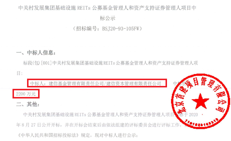 也有招标网站公布了中关村发展集团基础设施REITs公募基金的中标情况,建信基金及建信资本联合体中标了相关基础设施REITs项目,中标金额为2200万元。