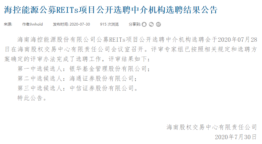 7月底,海南省发展控股有限公司公告,海南海控能源股份有限公司公募REITs项目公开选聘中介机构选聘会在海南股权交易中心有限责任公司会议室召开。银华基金、海通证券、中信证券分别成为第一中选候选人、第二中选候选人、第三中选候选人。