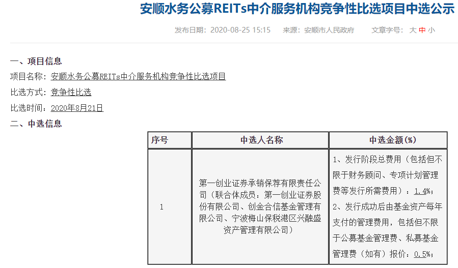 8月25日,安顺市人民政府官网发布《安顺水务公募REITs中介服务机构竞争性比选项目中选公示》公告。公告称,在安顺水务公募REITs中介服务机构竞争性比选项目中,第一创业证券承销保荐有限责任公司成为中选人,其中,联合体成员包括,第一创业证券股份有限公司、创金合信基金管理有限公司、宁波梅山保税港区兴融盛资产管理有限公司。发行阶段总费用为1.4%;发行成功后由基金资产每年支付的管理费用为0.5%。