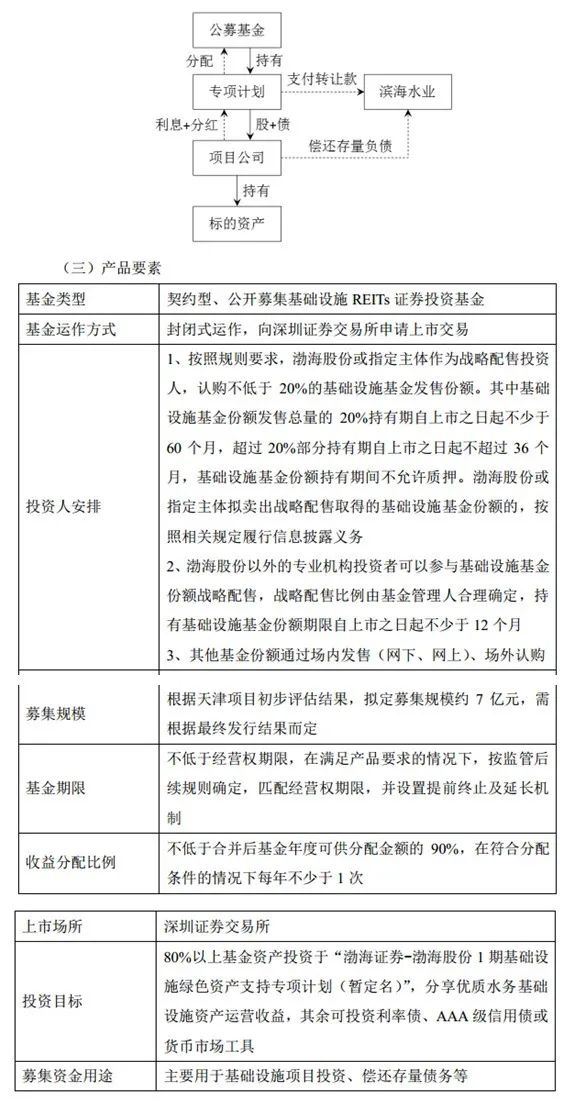 公告还展示了该公募REITs运作的基本模式和产品要素,拟募集规模约7亿元,80%以上基金资产投资于“渤海证券-渤海股份1期基础设施绿色资产支持专项计划”,分享优质水务基础设施资产运营收益,其余可投资利率债、AAA级信用债或货币市场工具。