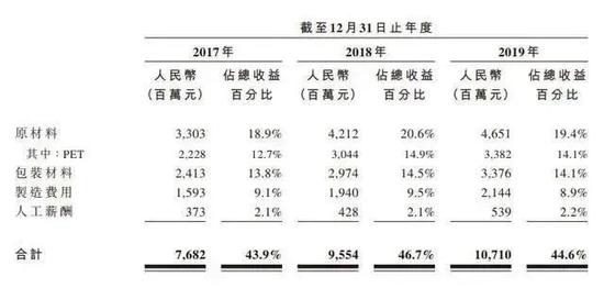 招股书显示,农夫山泉生产所需原材料是用于生产瓶子的PET,占总成本的31.6%。还有纸箱、标签、收缩膜等成本,达31.5%。整个包装的成本就占到6成。