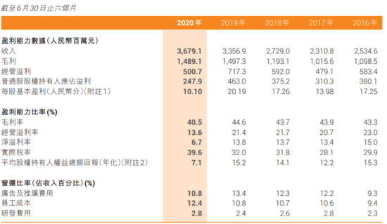 如果再观察毛利率、经营溢利率等指标,特步国际的盈利能力或呈趋弱状态。中报显示,今年上半年,该公司毛利率为40.5%,同比减少4.1%;经营溢利率录得13.6%,同比减少7.8个百分点;净溢利率录得6.7%,同比下降7.1个百分点。