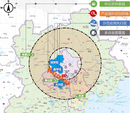 “两区”是示范应用先行区,北部区域为延庆区与昌平区,分别借助冬奥会契机和车辆高端制造及应用示范基地,开展氢燃料汽车示范应用。南部区域为大兴区,依托中国(河北)自由贸易试验区大兴片区,集合大兴国际机场和货运物流集散中心优势,在机场巴士、货运物流等领域推广应用氢燃料电池汽车;