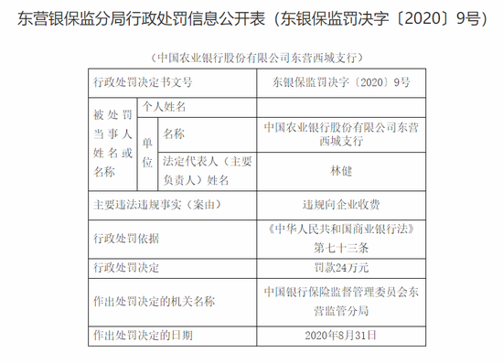 9月10日消息,东营银保监分局公布的行政处罚信息公开表显示,中国农业银行股份有限公司东营分行因贷前调查不尽职,被处罚款35万元;中国农业银行股份有限公司东营河口支行因违规向企业收费,被处罚款6万元;中国农业银行股份有限公司东营西城支行因违规向企业收费,被处罚款24万元。