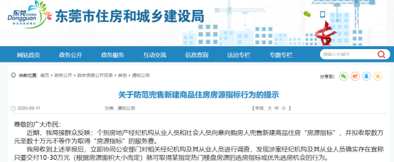 9月11日,东莞市住建局发布《关于防范兜售新建商品住房房源指标行为的提示》,对兜售“房源指标”等行为进行了打击。