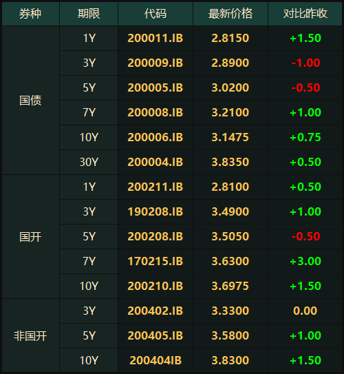 国债期货全线收跌,10年期主力合约跌0.22%,5年期主力合约跌0.07%,2年期主力合约跌0.02%。沪指窄幅震荡,收于3278.81,涨0.57%。剩余期限9.76Y 20国开10 收益率震荡上行,最高成交在3.72%,最低成交在3.6875%,实时行情3.6975%,较昨收上行 1.5BP。今日成交 761笔(昨日成交1038笔)。