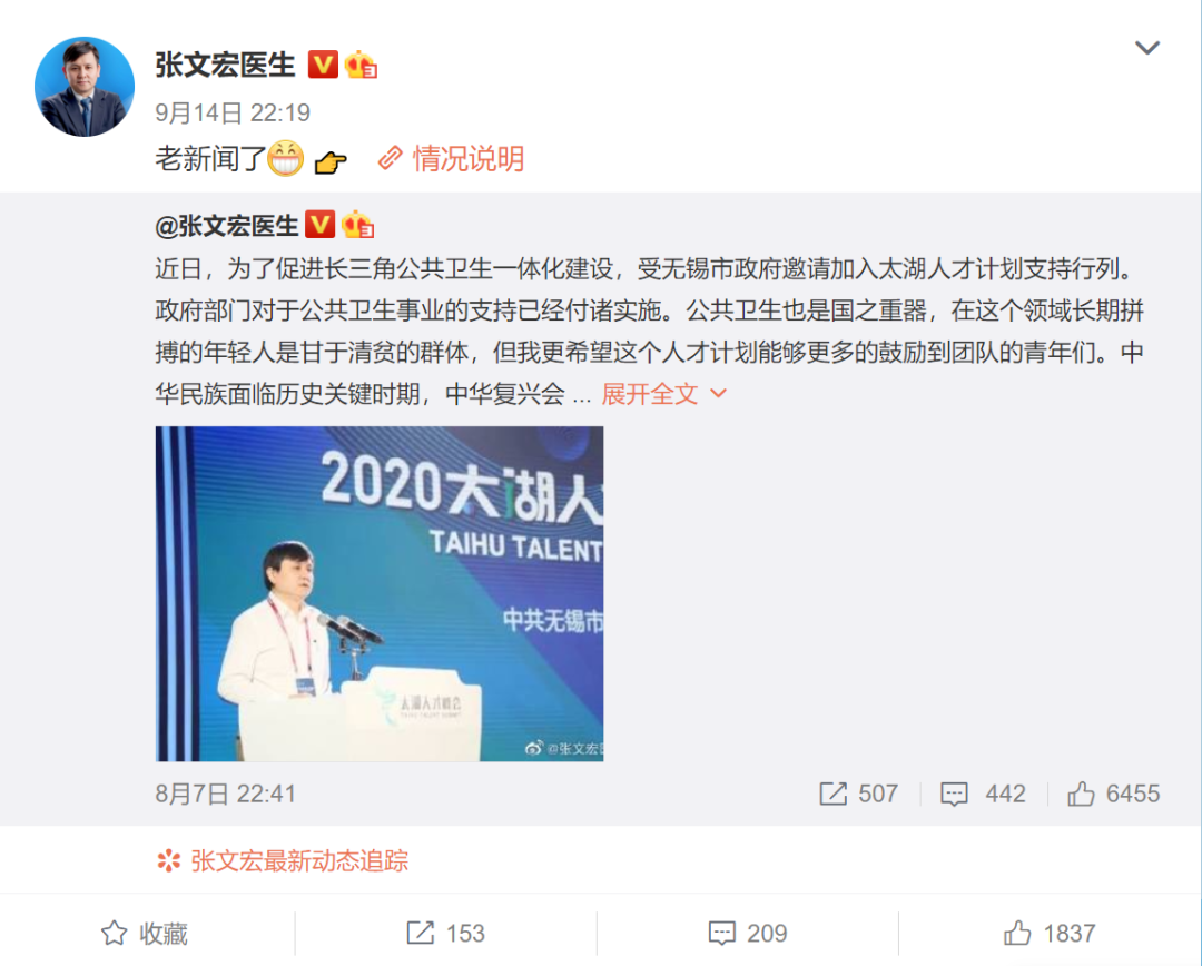 “老新闻”指的是今年8月初,在无锡举行的太湖人才峰会上,复旦大学附属华山医院感染科主任、上海市新冠肺炎医疗救治专家组组长张文宏带领的无锡市第五人民医院感染科团队被评为2020年度“太湖人才计划”医学专家团队,并现场获得1000万元奖励。