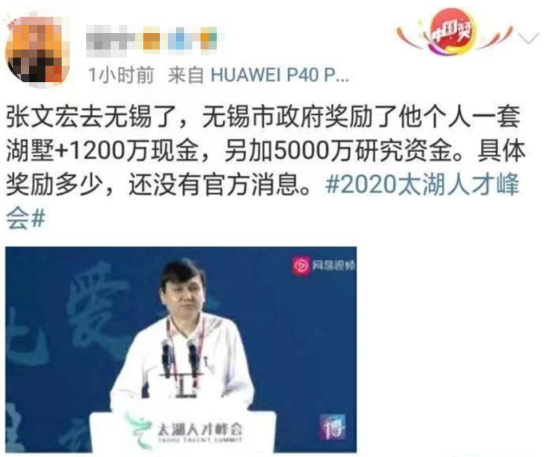 9月14日,一条有关张文宏医生的微博再次引起热议,某微博博主发布信息称:“张文宏去无锡了,无锡市政府奖励了他一套湖墅+1200万现金,另加5000万研究资金。具体奖励多少,还没有官方消息。”