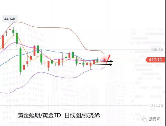 TD金自昨日周一晚间开于415.00元/克后,直接上涨,最高触及417.90元/克,虽有回落收线,但仍保持强势。今日周二日间行情,金价继续延续反弹走高,并在突破中轨等阻力后有所稳健。指标上,KDJ保持金叉向上,MACD绿色有殆尽并转强趋势,暗示存在进一步反弹。