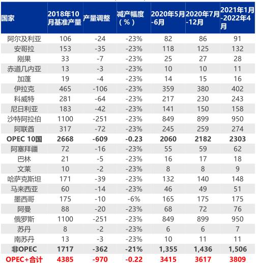 表3、OPEC+在2020年4月12日达成新的减产协议(万桶/天)