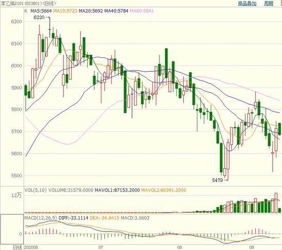 步入9月以来,国内苯乙烯期货2101合约呈现先扬后抑的走势,期价最高涨至5880元/吨一线,不过在原油期货价格大幅回落的拖累下,随后苯乙烯期货2101合约单边快速走低,一度下探至5500元/吨一线附近。虽然目前苯乙烯处于基本面的偏空逻辑,且贸易商逢高出货,整体交投气氛不佳,但基于成本支撑优势,预计后市苯乙烯期货2101合约料将维持区间箱体振荡整理的走势。
