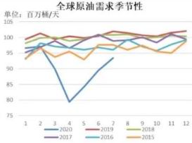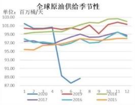 图3、2020年全球原油供应与需求季节性走势图(百万桶/日)