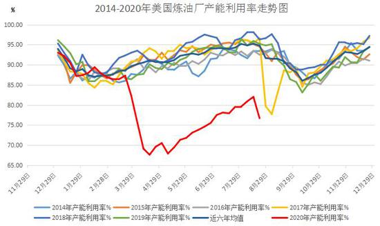 图5、2014-2020年美国炼油厂产能利用率走势图