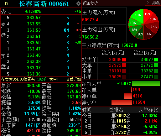 长春高新股价持续走低。截至发稿,跌逾5%,报363.50元,成交额13.85亿元。