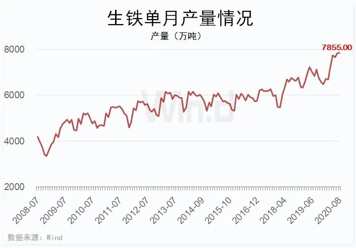 今年前8个月,生铁累计产量58940万吨,同比增速3.4%,产量创同期历史新高。