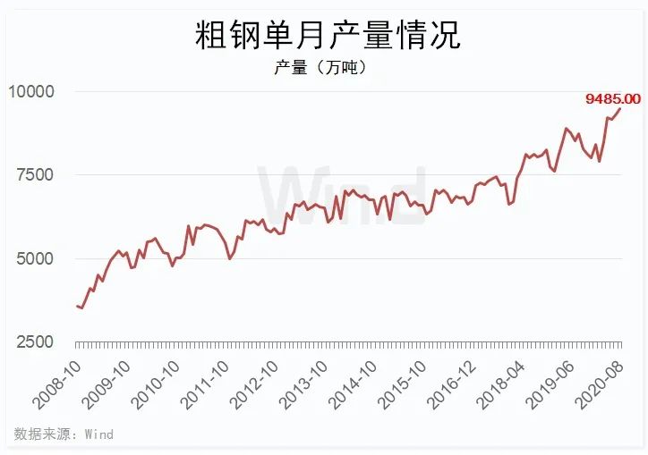 Wind数据梳理显示,8月份中国粗钢产量9485万吨,已连续两个月刷新单月历史新高,且单月产量已连续4个月超过9000万吨。