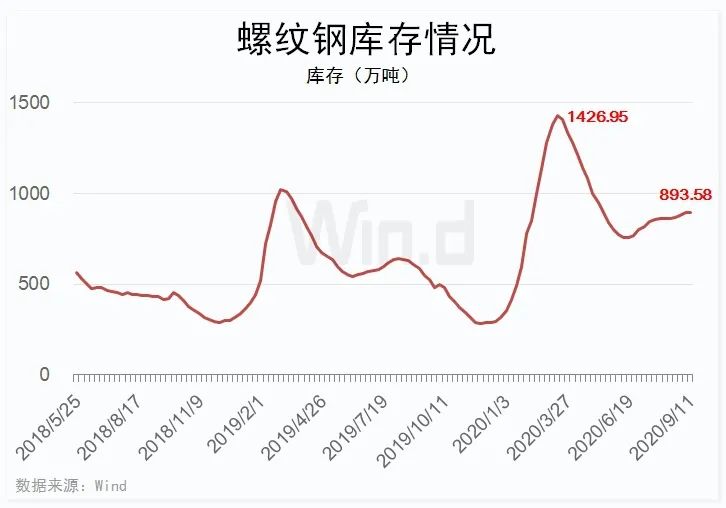 值得注意的是,钢材库存方面,Wind梳理显示,最新一期螺纹钢库存报893.58万吨,连续四期攀升,并创5月中旬以来新高。