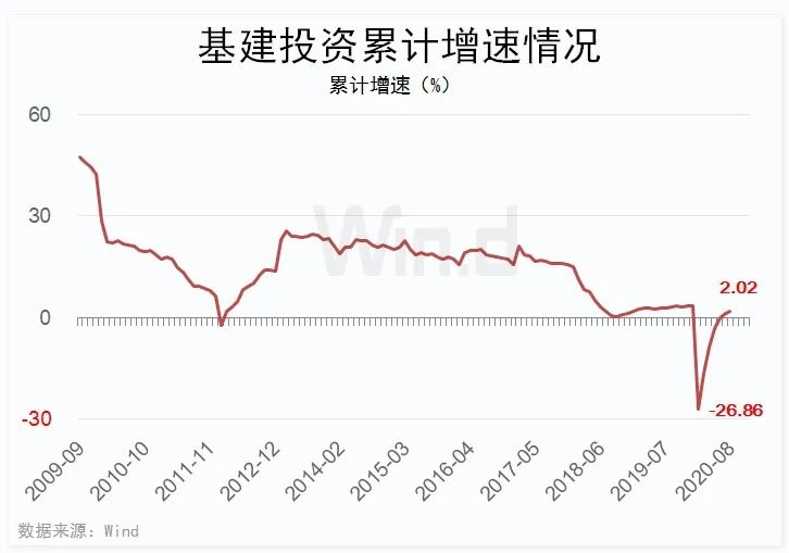 2、基建方面,1-8月份基建投资累计同比增速2.02%,增幅比1-7月份提升0.83个百分点。