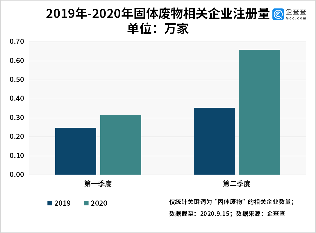 企查查数据显示,2020年上半年共新注册固体废物处理相关企业0.98万家,同比增长63.3%。其中,二季度注册量为0.66万家,环比增长106%,同比增长88.6%。